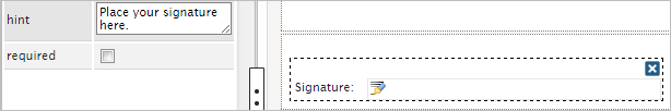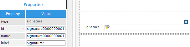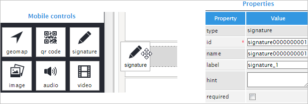 On the left side of the Dynaform, open the Mobile Controls tab by clicking on it to display the mobile controls. Drag and drop the Signature control into the form. Click on the control in the Dynaform to display the properties under the Mobile Controls menu in the left panel.