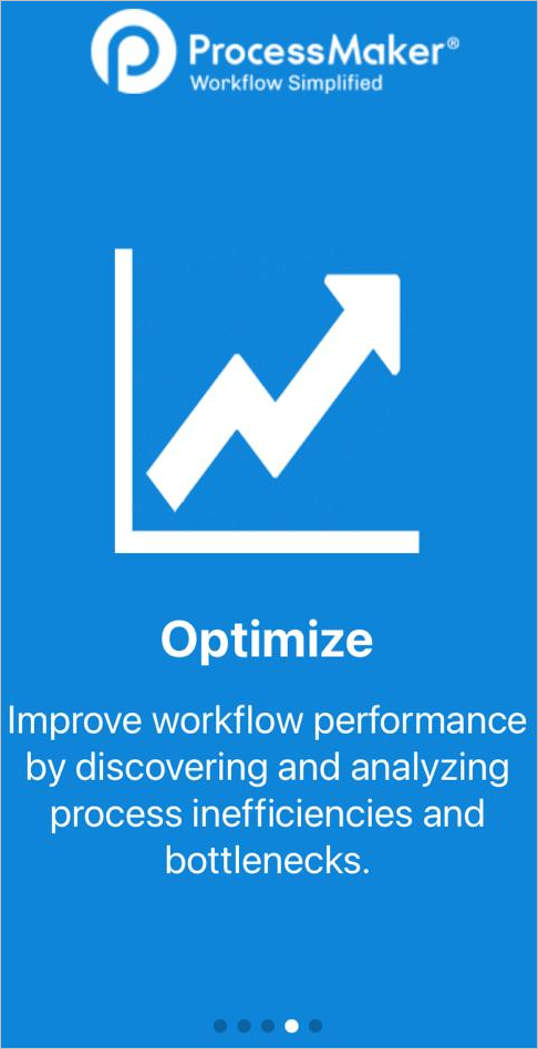 The first time that ProcessMaker mobile is opened, a summary of the product features displays. Each of the screens shows a brief description of a few ProcessMaker Mobile functions: