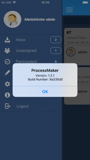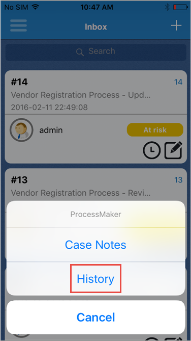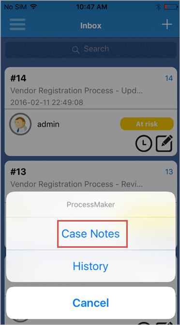 This section discusses how to use the case list, as well as several other options when running a case on a ProcessMaker Mobile version of iOS. After you log on, the Inbox screen displays.