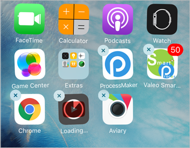 Uninstall ProcessMaker Mobile from the device by tapping on its icon without letting it go for a few seconds. All applications available to be uninstalled have a blue cross in the upper left part of their icon.