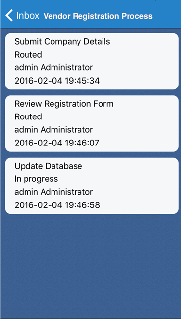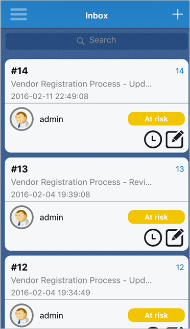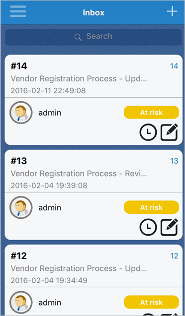 The Inbox screen displays the list of all the cases assigned to you in the ProcessMaker desktop version. The cases are initially ordered first by their case number and then by the name of the case. Choose a case in the Inbox and tap on it.