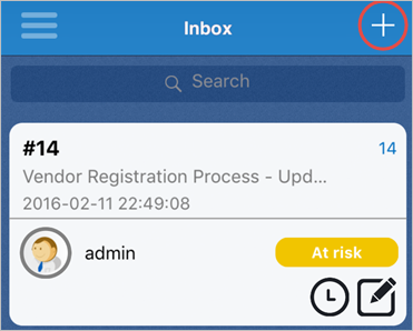 The ProcessMaker Mobile app allows you to create a new case of a process previously created in the ProcessMaker Web Edition. The New Case list displays all the cases that you have been designated to participate in, but have not yet begun. To start a case, tap on the plus sign button located at the bottom of the screen marked with a red circle.