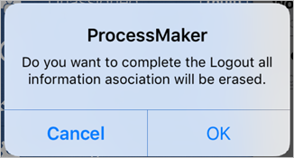 After tapping the Logout button, a screen displays to confirm you want to log out. If you log out, any unsaved case information is erased. Tap on OK to quit the ProcessMaker Mobile app or tap on Cancel to go back to the main screen.