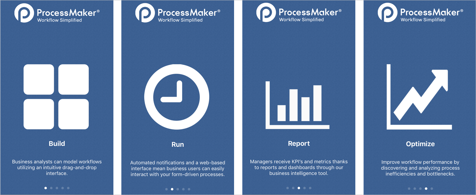 When the application opens, it shows a summary of the application's features. Each of the screens show a brief description of what ProcessMaker can do, like the image below: