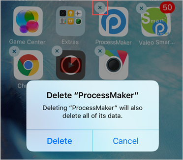 Tap on the "x" in the top left corner of the ProcessMaker icon and a confirmation screen appears. Tap on the Delete button to erase ProcessMaker Mobile from your device.