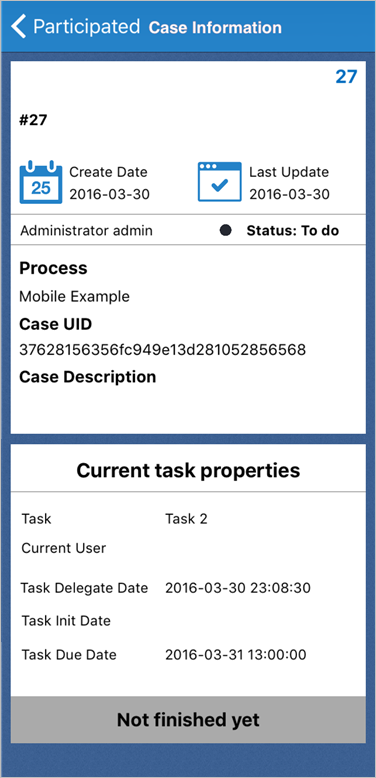 When any "Participated" case is tapped on, the information about the case displays, including but not limited to the creation date, the last date updated, the owner, and the name of the process.