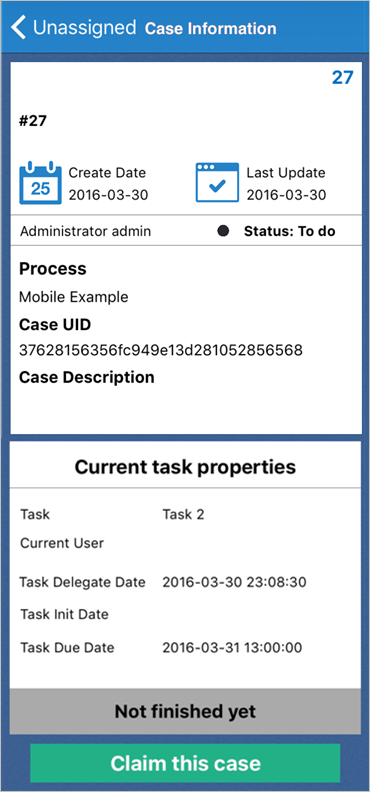 The Unassigned panel displays all cases that can be claimed by a pool of users assigned to the task. You can assign yourself a task, which then removes it from the Unassigned panel. When there are cases in the Unassigned panel, then anyone can claim the case to work on it. Once opened, details about the unassigned case, like the status, date, description and more, are shown.