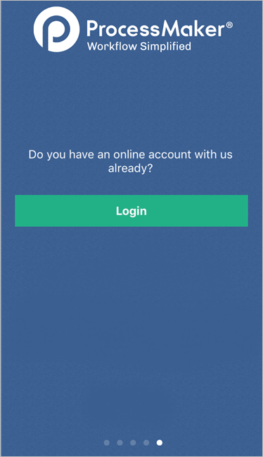 The last screen is a login screen. The screens summarizing ProcessMaker's features do not appear after starting the app for the first time; the login screen appears instead. If you have a ProcessMaker account, then tap on the Login button, otherwise, tap on the Register button.