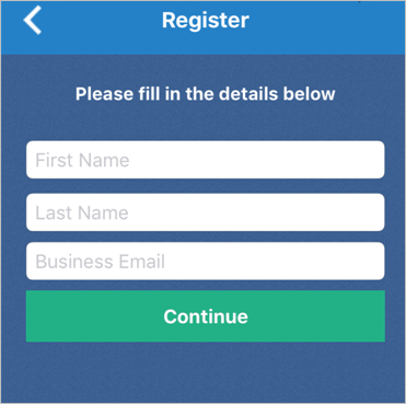 If the Register button is clicked, a new window appears where a new account can be created by entering the first name, last name, and business email into the fields displayed. Tap on Continue after filling in the information.