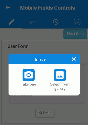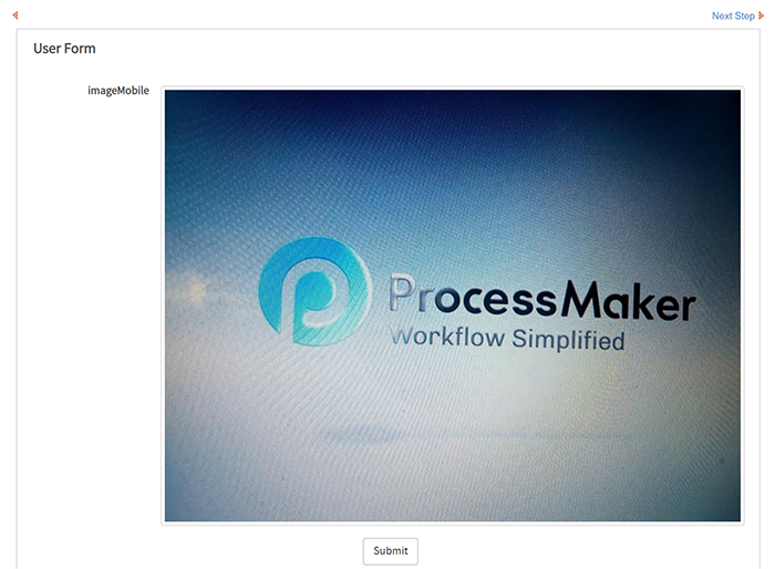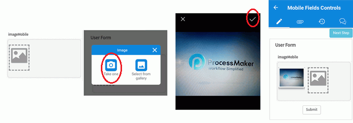 ProcessMaker Mobile features the image control, which lets you take a picture using the camera of a smartphone and save this picture into a Dynaform, or upload a picture from the smartphone's current gallery.
