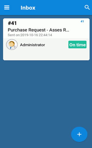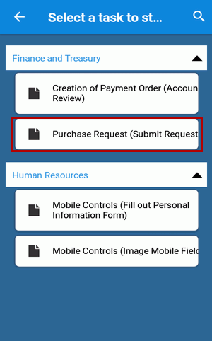 A list of available tasks assigned to the current user will be shown. Tap on the "Purchase Request" process that was created.