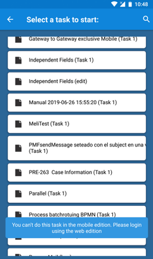 Note: The Output Document, Input Document, and External Step features are not available for ProcessMaker Mobile as step: they will not open or create the case if any of those features are on the first task of the display list. The following alert message displays “You can’t do this task in the mobile edition. Please login using the web edition.”