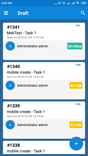 The Draft panel includes cases that are being created but have not been submitted to the next task yet. Cases are considered to be in Draft status after you edit the case data by submitting a Dynaform or after moving on to a subsequent step in the current task. The list displays cases with one of the following three case statuses: On time, At risk or Overdue.