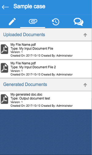 The Files Attached panel has two subsections that can be stretched by taping the arrow icon located at the top-right of each section. One section lists the uploaded documents and the other section lists the generated documents. You can download files with the relevant permission assigned.