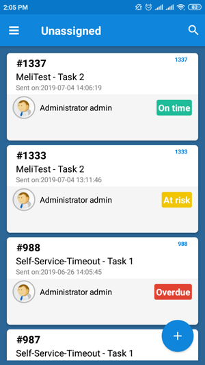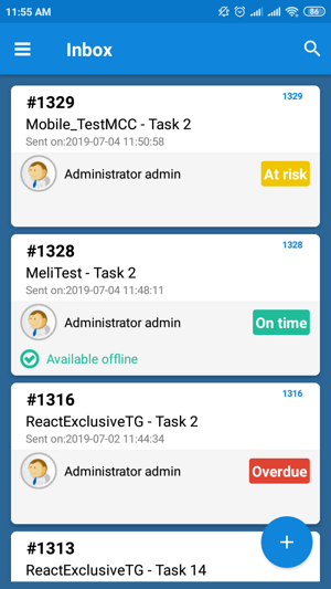 The Inbox panel lists all the cases assigned to you. The cases are sorted first by their case number, and then by the name of the case. The list displays cases with one of the following tree case statuses: On time, At risk or Overdue. Cases that can be worked offline are marked with the label "Available Offline." To learn more about offline cases, see Processmaker Offline Mobile.
