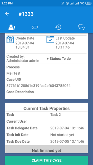 The Case Tabs displays the main case view by default where a case summary displays details about the unassigned case, details like status, date, description and more. At the end of the case summary, you can tap CLAIM THIS CASE to assign the case to yourself and to start working on it.