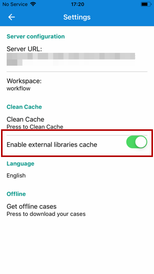 The Enable external libraries cache option is available to improve the performance of the ProcessMaker app. If this option is turned on, the JavaScript libraries are downloaded in the device cache to load Dynaforms and sub-forms faster.