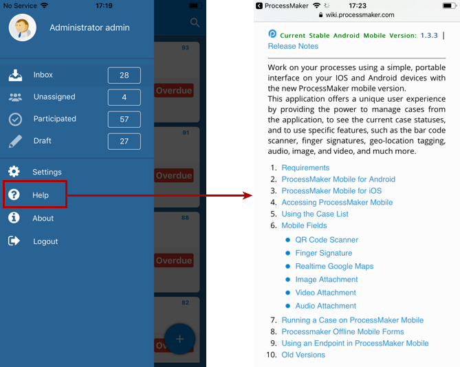 This option redirects you to the ProcessMaker wiki. Useful information about the mobile application can be found on this page. Tap Help, and the mobile web browser opens the wiki page.