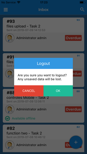Go to the main menu by sliding the screen to the right. Tap the Logout option. The Logout option will ask you if you are sure you want to quit, because all data that was not saved will be lost. Tapping OK quits the ProcessMaker app and go back to the main screen. Otherwise tap CANCEL.