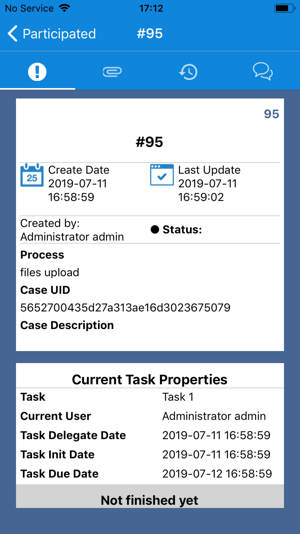 The Files Attached panel lists documents uploaded and generated when the case was running in the ProcessMaker Web edition. In ProcessMaker Mobile, to see this option when running a case in the Case Tabs, tap the Clip tab.
