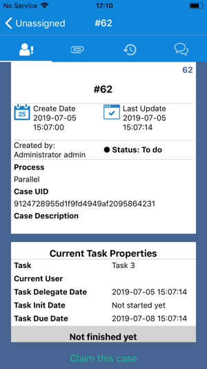 - If the case has been accessed from the Unassigned tray, the main case view displays the case summary, the current task properties and also the Claim this case button at the end of the screen.