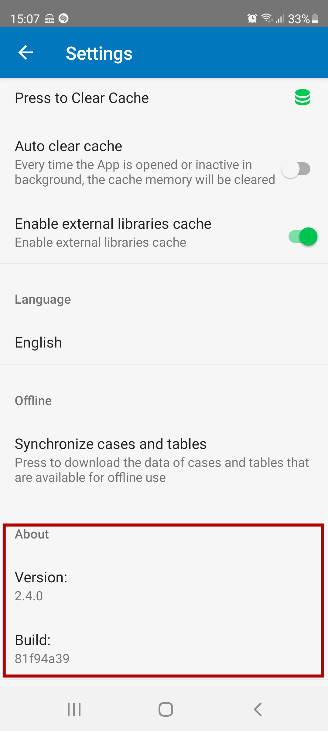 A window displays the version of the app and the build code. Tap Ok to quit the window and to go back to the main screen.