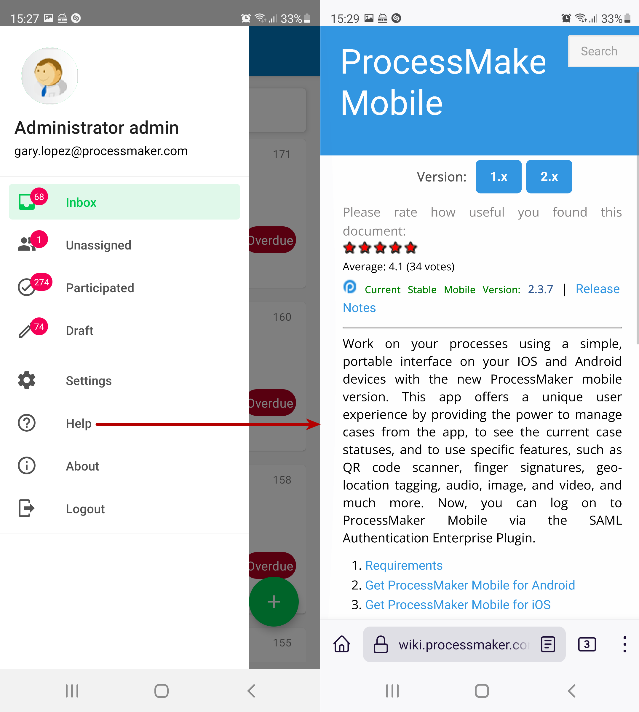 This option redirects you to the ProcessMaker wiki. Useful information about the mobile application can be found on this page. Tap Help, and the mobile web browser opens the wiki page.