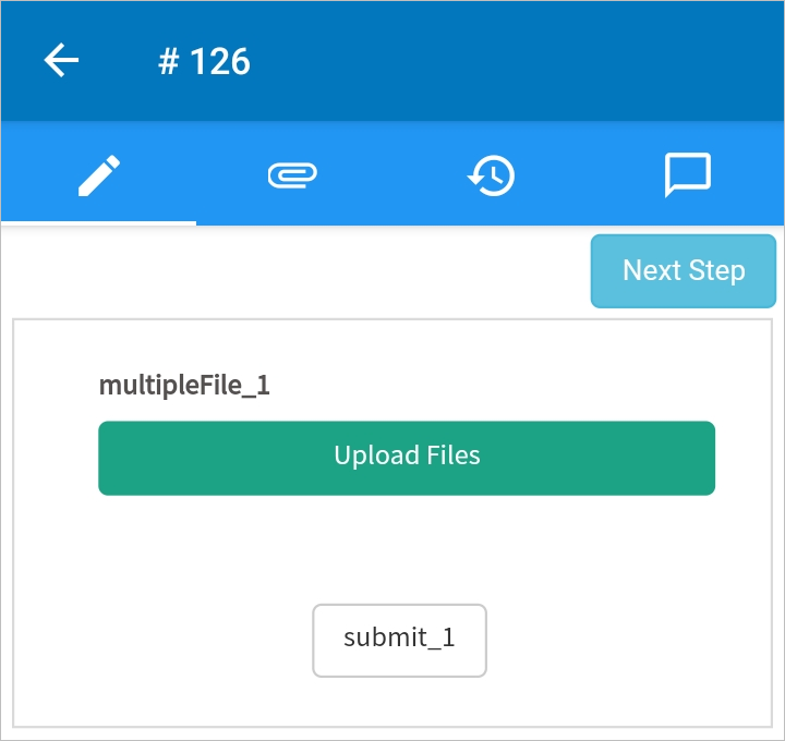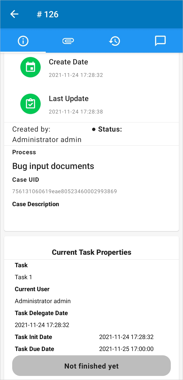 The Files Attached panel lists documents uploaded and generated when the case was running in the ProcessMaker Web edition. In ProcessMaker Mobile, to see this option when running a case in the Case Tabs, tap the Clip tab.