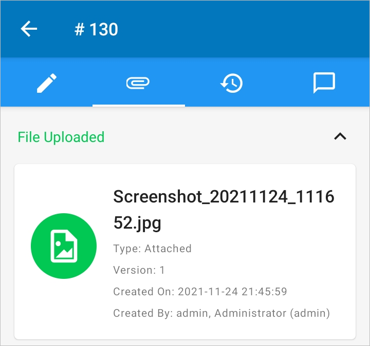 The Files Attached panel has two subsections that can be stretched by taping the arrow icon located at the top-right of each section. One section lists the uploaded documents (File Uploaded) and the other section lists the generated documents (File Generated). You can download files with the relevant permission assigned.