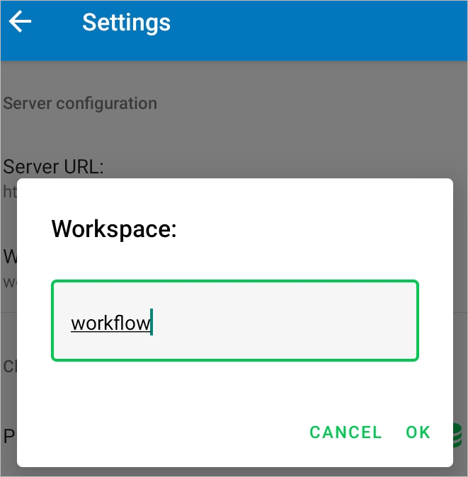 As part of the server configuration, in the Workspace field, type the workspace name such as workflow. If using a personal ProcessMaker server, the default workspace is workflow. Then, tap OK.