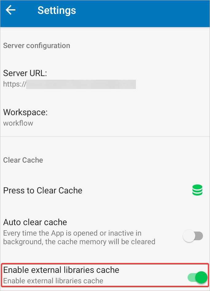 The Enable external libraries cache option is available to improve the performance of the ProcessMaker app. If this option is turned on, the JavaScript libraries are downloaded in the device cache to load Dynaforms and sub-forms faster.