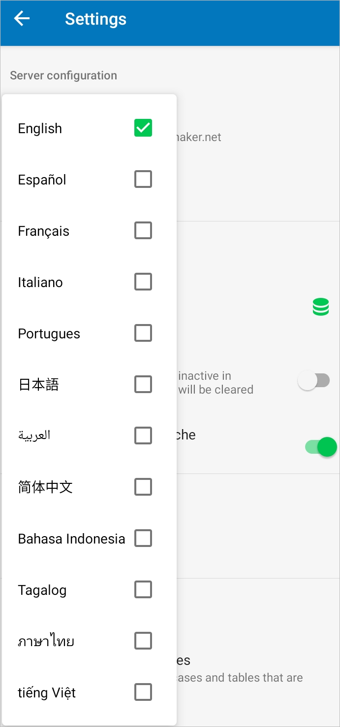 Tap an option to change the language. For example, choose "Portuguese" and automatically the changes take effect throughout the whole application.