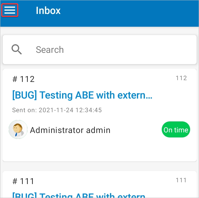 The Inbox panel lists all the cases assigned to you. The cases are sorted first by their case number, and then by the name of the case. The list displays cases with one of the following tree case statuses: On time, At risk or Overdue. Cases that can be worked offline are marked with the label "Available Offline." To learn more about offline cases, see ProcessMaker Offline Mobile.