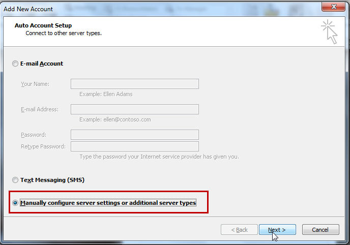 The Internet E-mail Settings screen displays, select the option to connect to a POP or IMAP email account serverThis configuration depends on the supported email server configuration for POP and IMAP. See this documentation to view how to configure some of the most used email servers.