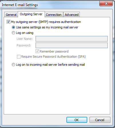 Inside the Internet Email Settings screen, choose the Outgoing Server tab and set it as the picture below: