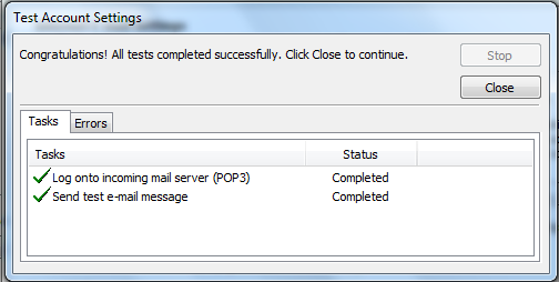 After all tests are complete, the account is configured. Click Close to exit.