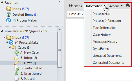 This functionality can be configured when ProcessMaker server is configured inside the Outlook, it means that the user can decide if whether the Cases Menu will display it or not. This is practically the same as the one you will find in ProcessMaker. Next you will find a brief explanation of each one of these options: