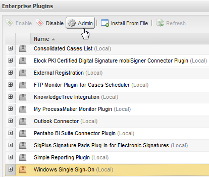 Select the Windows Single Sign-On plugin from the list and click the ADMIN button.