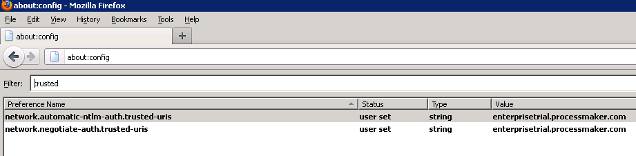 To enable Windows Single SignOn functionality it is necessary to configure the browsers in which the system will be used, in Mozilla Firefox enter the advanced settings, this is done by entering in the address bar "about: config", once there look for the word "trusted" and in the 2 results that appear add the servers where are installed ProcessMaker and Plexcel (if there are many separated them by commas).