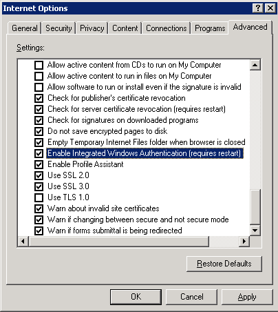 On Internet Explorer enter Tools -> Internet Options -> Advanced and check that the option Enable Integrated Windows Authentication is enabled.