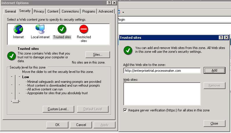 Finally enter into Tools -> Internet Options -> Security -> TrustedSites -> Sites and add the names of the places where it is installed and ProcessMaker and Plexcel.