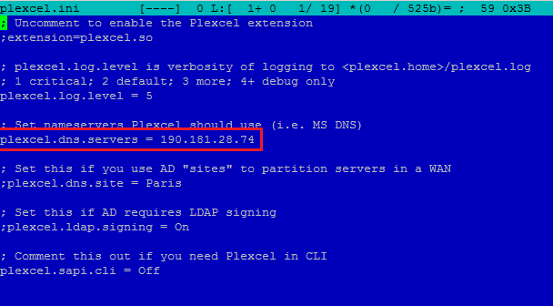 • Modify the plexcel.ini file located in /etc/php.d/ for RedHat or /etc/php5/cli/conf.d/ for Ubuntu. Then add the DNS server IP where the connection will be set up as shown in the image below: