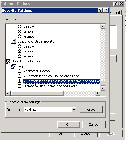 Then enter to Tools -> Internet Options -> Security and both Internet and Local Intranet verify that it is selected the option Automatic logon with current user and password.