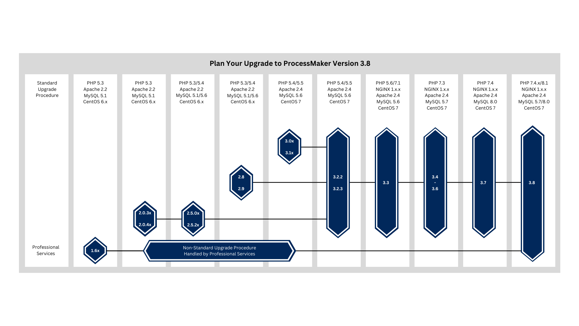 • Upgrading from version 1.6x or older: ProcessMaker Professional Services must perform the upgrade to a current version. This upgrade path is not supported.