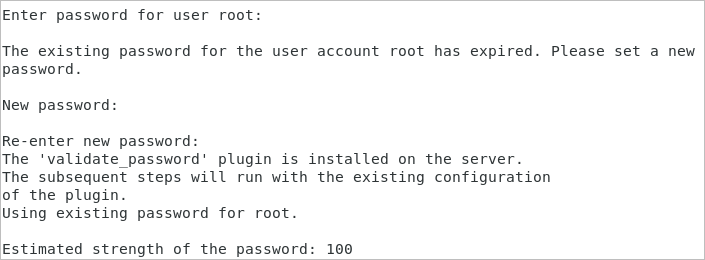 Warning: The default password policy implemented by validate_password of MySQL 5.7 requires that passwords contain at least one upper case letter, one lower case letter, one digit, and one special character, and that the total password length is at least 8 characters. To know more about validate_password, see The Password Validation Plugin.