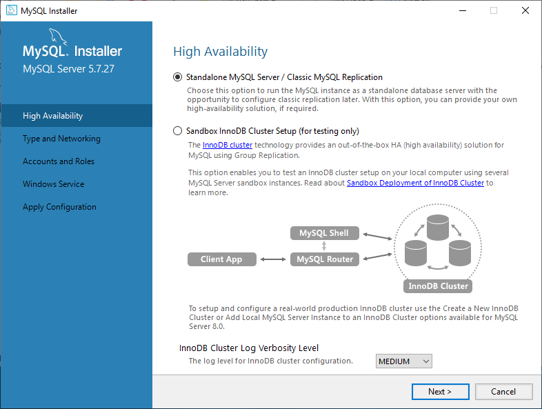 The High Availability screen displays. It is recommended to select Standalone MySQL Server / Classic MySQL Replication. Then, click Next.