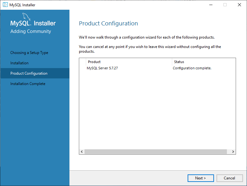 The Installation Complete screen displays. Click Finish. The MySQL installation is complete.