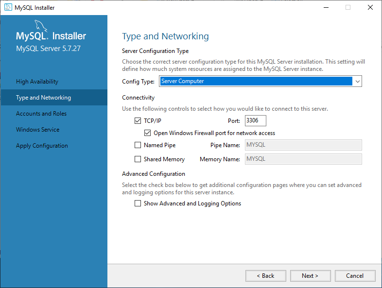 For more information about the Accounts and Roles step, visit the page MySQL reference manual.