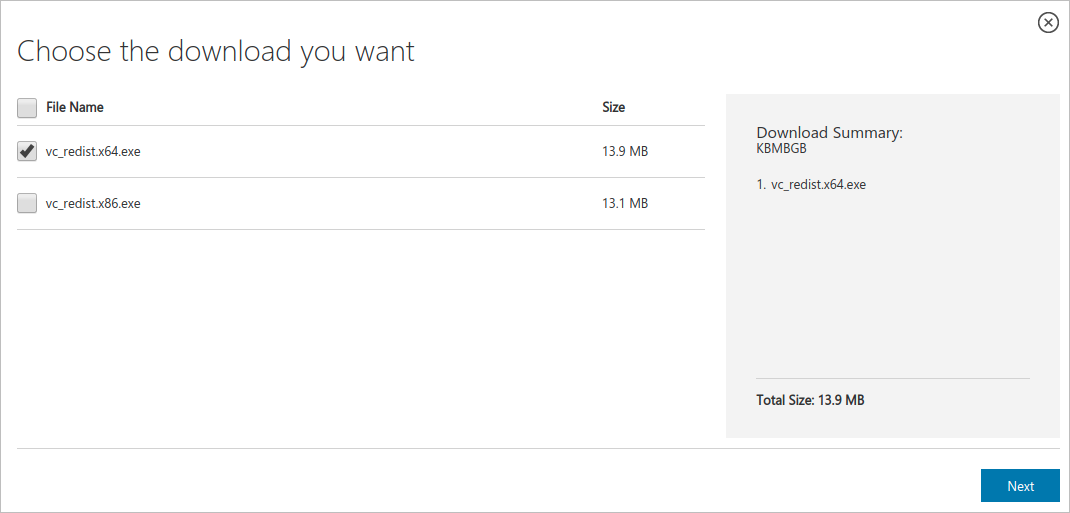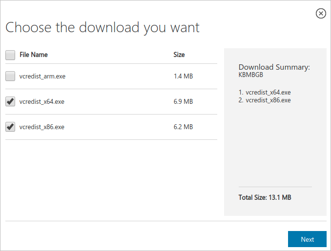Choose vcredist_x64.exe and vcredist_x86.exe, and then click Next.