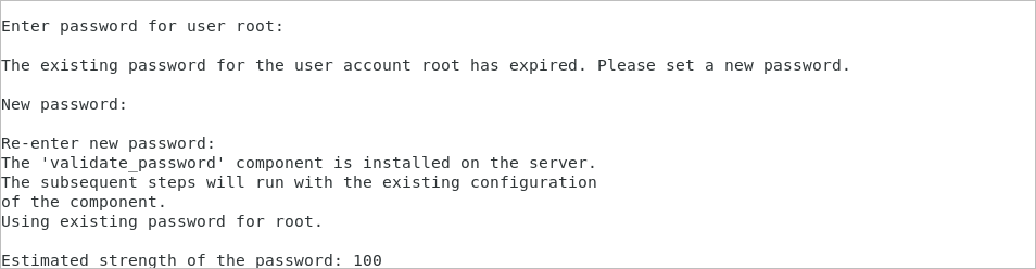Warning: The default password policy implemented by validate_password of MySQL 8.0 requires that passwords contain at least one uppercase character, one lowercase character, one numeric character, and one special (nonalphanumeric) character, and that the total password length is at least 8 characters. To know more about validate_password, see The Password Validation Plugin.